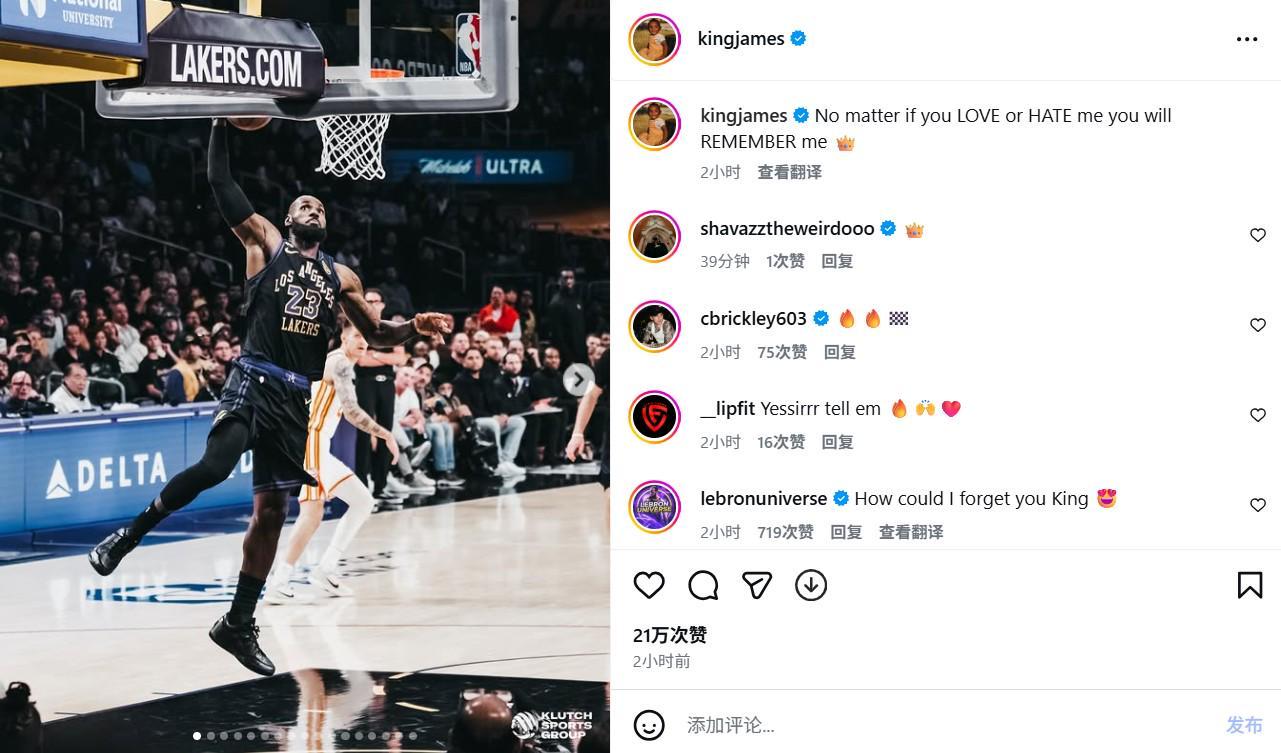 北京时间今日,湖人队球星勒布朗-詹姆斯更新个人社媒,他在完成本赛季首次背靠背比赛后晒出了上一场的比赛照,并配文抨击了自己的“黑粉”。