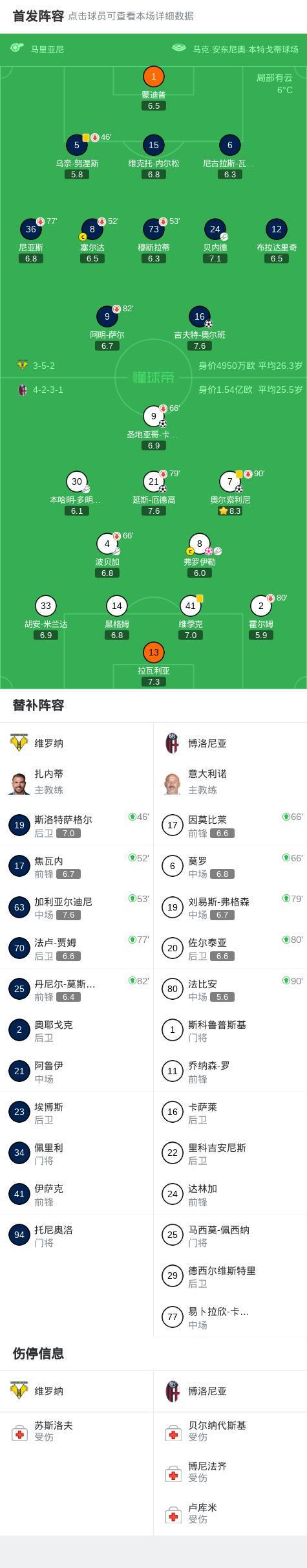 北京时间1月16日意大利足球顶级联赛 联赛 第16轮,维罗纳主场对阵博洛尼亚。维罗纳吉夫特-奥尔班破门。博洛尼亚奥尔索利尼破门, 延斯-厄德高破门,圣地亚哥-卡斯特罗破门,弗罗伊勒自摆乌龙。最终比分维罗纳 2-3 博洛尼亚。