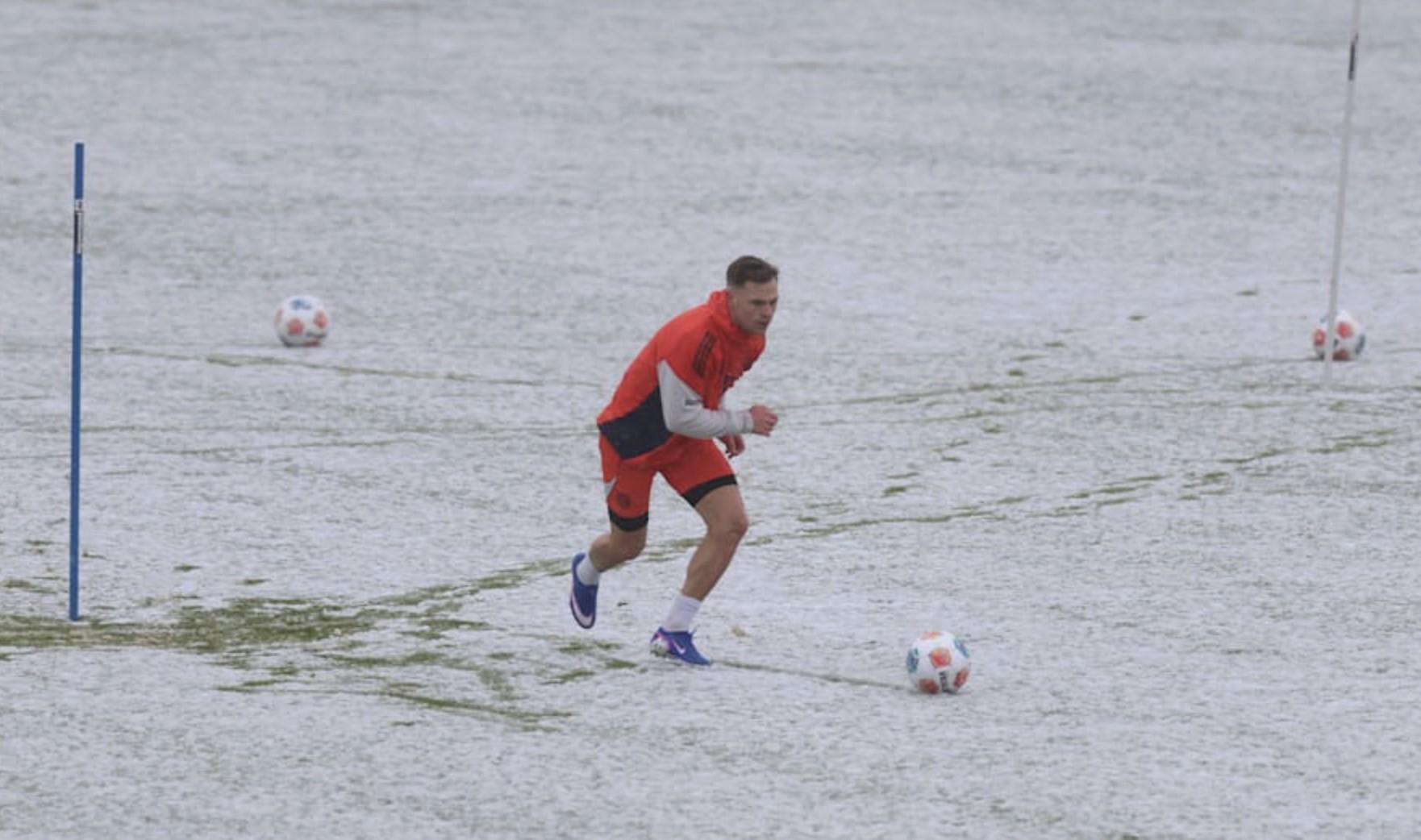 当时气温为零下3摄氏度,新雪覆盖了训练场。康复主管本雅明-佐默裹着厚厚的外套,而基米希却只穿着短裤训练,甚至在热身前多次用雪搓揉自己的小腿。