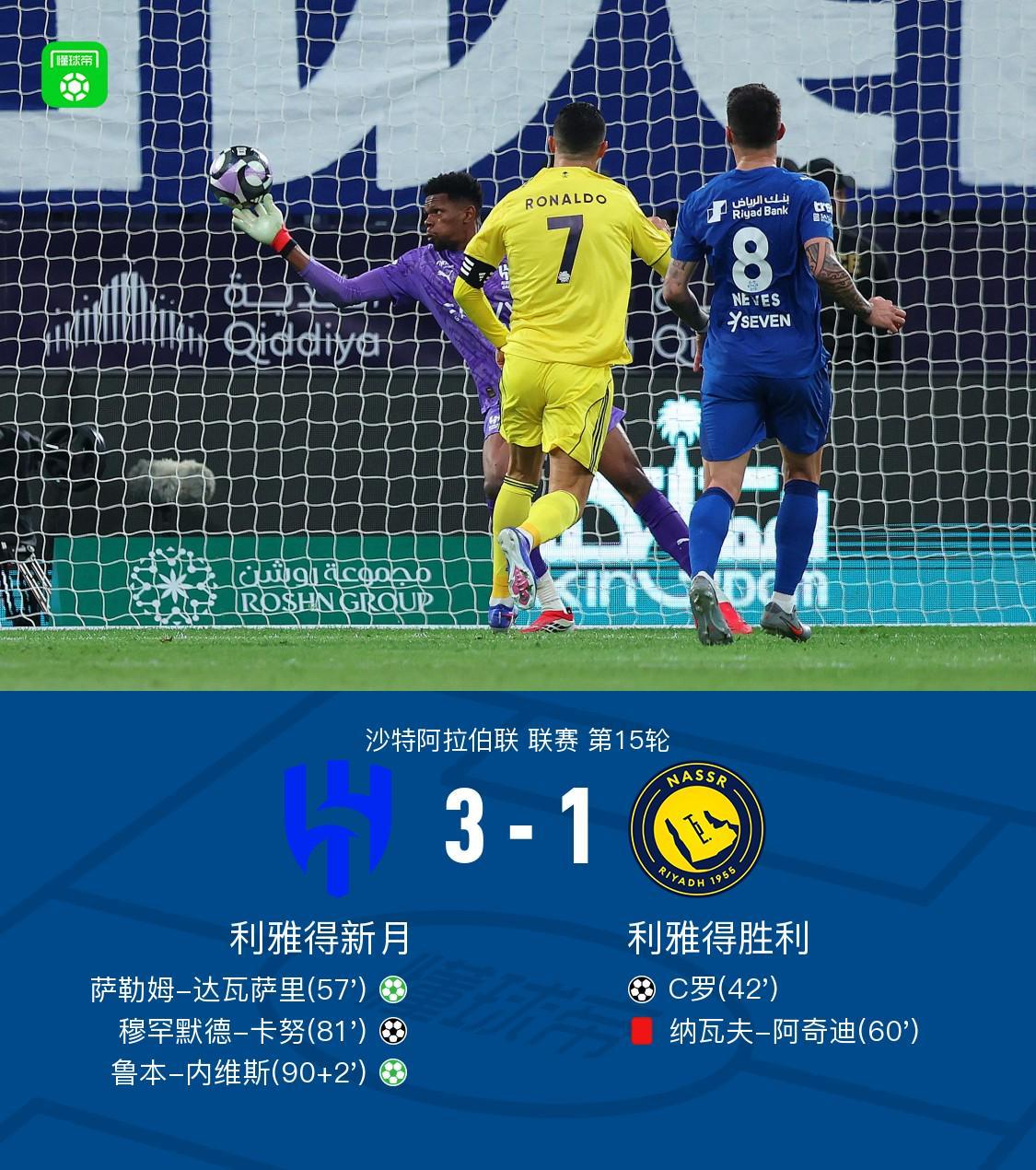 北京时间1月13日沙特阿拉伯联第15轮,利雅得新月主场对阵利雅得胜利。上半场,C罗接科曼妙传破门,下半场,利雅得新月达瓦萨里、卡努、内维斯连扳三球,阿奇迪冲动染红。最终比分利雅得新月 3-1 利雅得胜利。