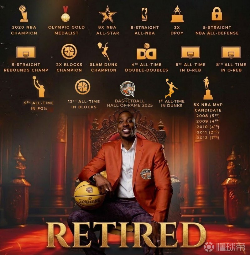 北京时间3月13日,霍华德正式宣布退役,霍华德一共在NBA效力了18个赛季,拿到过一座NBA总冠军,8次入选全明星,3次当选DPOY。