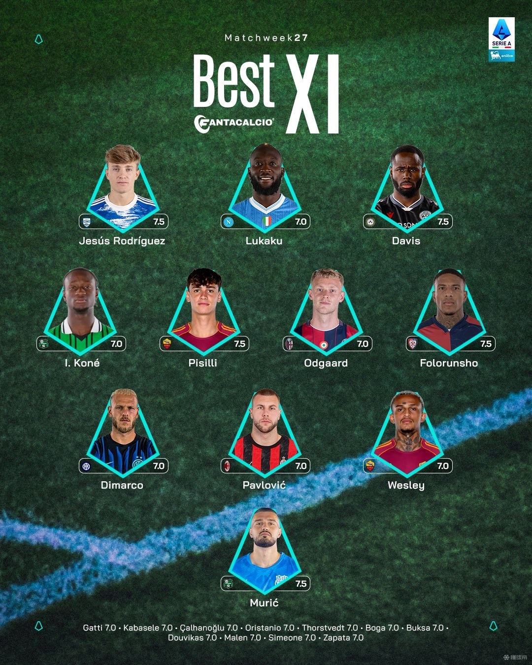 中场:伊斯梅尔-科内(萨索洛)、皮西利(罗马)、延斯-厄德高(博洛尼亚)、弗洛伦肖(卡利亚里)